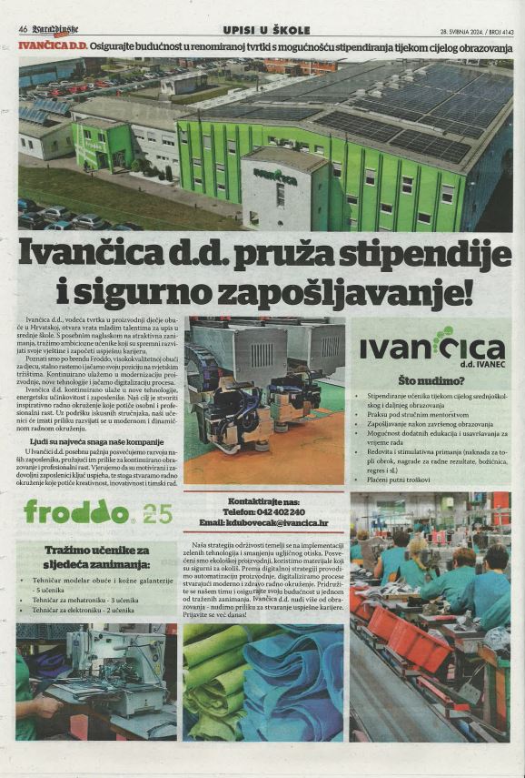 Ivančica d.d., vodeći proizvođač obuće u Hrvatskoj s vlastitim brandom dječje obuće Froddo, s ponosom objavljuje nedavno ostvareno postignuće - stjecanje ISO 45001:2018 certifikata. Ovaj certifikat potvrđuje izvrsnost tvrtke u upravljanju zdravljem i sigurnošću na radnom mjestu te predstavlja novi korak u kontinuiranom nizu ISO certifikacija koje Ivančica d.d. uspješno ostvaruje. Također, tvrtka posjeduje i certifikate ISO 9001:2015 za upravljanje kvalitetom i ISO 14001:2015 za upravljanje okolišem, što dodatno potvrđuje predanost visokim standardima u održivom poslovanju.